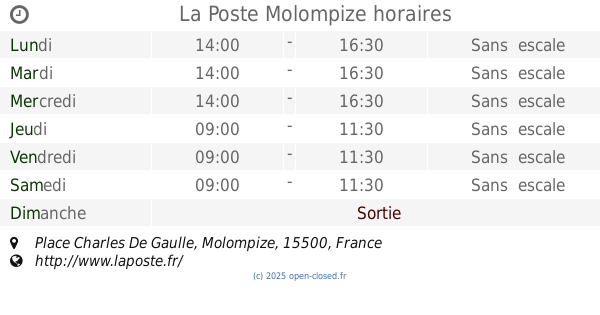 Add it to your website, your phone or even your desktop - opening times, phone numbers and the road to Branche of the La Poste Dans Molompize, Place Charles De Gaulle.
